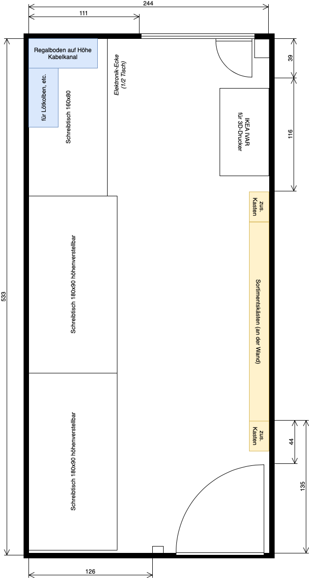 - Die weiteren Schreibtischplätze sollen zur allgemeinen Verfügung stehen, z.B. um in Ruhe zu Hacken, temporär weitere Lötkolben aufzustellen, etc.